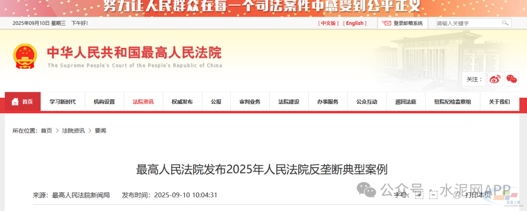 据最高人民法院官方消息,人民法院通过依法裁判垄断案件,维护公平竞争秩序,为建设全国统一大市场提供坚实的司法保障。为充分发挥司法裁判的示范引领作用,在2025年中国公平竞争政策宣传周活动期间,最高人民法院于9月10日发布5件反垄断典型案例。其中包含水泥协会横向垄断协议”反垄断行政处罚案。